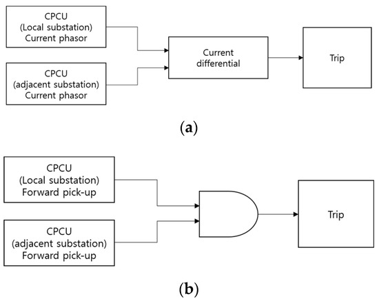 Figure 3a shows that the current differential protection element requires the current data from both sides of the protected element, such as a transmission line, a power transformer, and a busbar. Figure 3b shows that the distance-based directional comparison protection element detects a fault at a transmission line with each piece of forward pick-up data from both sides of the transmission line. Each CPCU can calculate an apparent impedance of a faulted line with voltage and current data and can detect a forward fault with the operating zone of the distance protection element. Therefore, if the forward pick-up of the CPCU at the local substation occurs and the forward pick-up GOOSE message arrives from the CPCU at the adjacent substation, the local CPCU sends a trip GOOSE message to the IMU corresponding to the faulted transmission line. This directional comparison protection element is used only for transmission-line protection.
