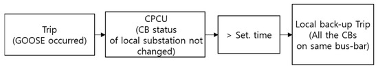 Figure 4 shows the block diagram of the local back-up protection function. The local back-up protection function is a countermeasure for circuit breaker (CB) failure. Although a trip signal is transmitted from a CPCU to a CB via an IMU, the corresponding CB cannot be opened because of a certain problem. Then, the local back-up protection element operates to open all the circuit breakers located at the same busbar to which the failed CB is connected. In this paper, a CB fail can be determined using the circuit breaker status data after the ignition of the trip order, i.e., if the CB is not opened during a setting time after the trip order, CB fail is detected.