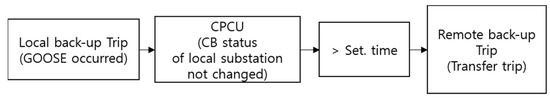 Figure 5 shows the block diagram of the remote back-up protection function. The remote back-up protection function is a back-up protection for the local back-up protection function. Nevertheless, when the local back-up protection element operates, a CB that is different from the first failed one cannot be opened. At this time, the remote back-up protection element operates to open the CB located at the adjacent substation connected by the transmission line that has the second failed CB at the local substation. In other words, the CPCU of the local substation sends a transfer trip order to the CPCU of the adjacent substation. The setting time of the local back-up and remote back-up protection are set to 1 cycle.