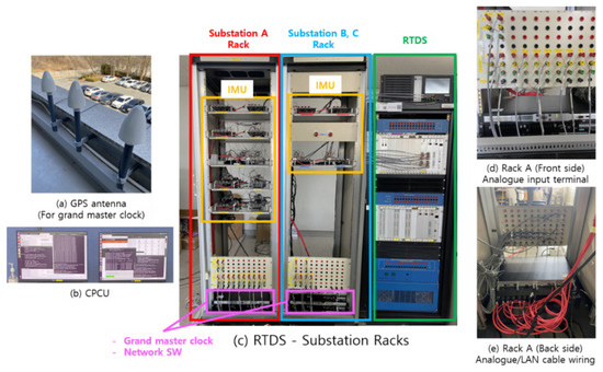 Figure 6c shows that 11 IMUs are installed in each substation rack. Figure 6d shows that each IMU collects analogue voltage, current, and CB/DS status data from the RTDS via the analogue input terminal of each rack. The target system for the case studies is modelled with RSCAD. The GPS antenna is installed for the time synchronization of the grand master clocks, as shown in Figure 6a. All the IMUs and CPCUs perform PTP-based time synchronization to the grand master clock. Figure 6b shows the CPCU, which collects analogue voltage, current, and CB/DS status data from the IMUs. Figure 6e shows that PTP-based time synchronization and IEC 61850 SV-based data publish/subscribe are performed via ETHERNET (using CAT 7 model) cable.