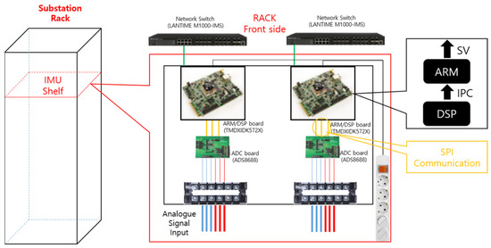 The IMU supports two functions, as mentioned before. One is the main protection function, while the other is the MU function. Figure 7 shows the IMU configuration diagram. Each shelf of the rack has two sets of IMUs, and each IMU set is implemented with TMDSIDK572X and ADS 8688 evaluation modules. TMDSIDK572X is a multiprocessor board from Texas Instruments, and the oscillator of the board is a normal crystal oscillator that has 30 ppm of clock accuracy at 20 MHz. The multiprocessor of TMDSIDK572X consists of ARM (Dual Cortex-A15 MP Core)/DSP (Two C66X DSP processors) cores. The LINUX PTP reference source code [21] was used to enable basic PTP functions. ADS 8688 is an ADC board, and Figure 5 shows that it supports the SPI protocol to transmit the ADC data to the DSP core of the TMDSIDK572X board. The sampling interval of ADS 8688 is set to 260.42 µs. When the DSP core of the TMDSIDK572X board receives the ADC data from ADS 8688, it estimates phasor data, then transmits that to the ARM core via the IPC protocol. Message queue is used for IPC. The ARM processor publishes the phasor data received over the IPC using SV.