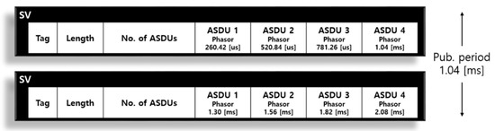 In this paper, since the centralized back-up protection uses the phasor data instead of the instantaneously sampled data defined in IEC 61850-9-2LE, the SV in conformance with IEC 61850-9-2 is used to exchange the phasor data. Thus, the sampling rate can be configured. The SV is set to publish every 1.04 ms, and the SmpRate is set to 64. The ‘No. of ASDU’ is set to four to publish the phasor data estimated from the instantaneous data measured at 260.42 µs intervals. Figure 8 shows that the oldest data are stored in ASDU1, while the second-oldest data are stored in ASDU2.