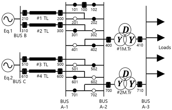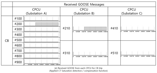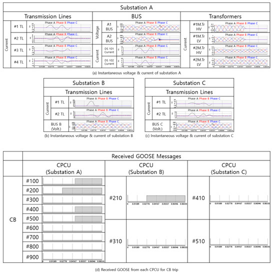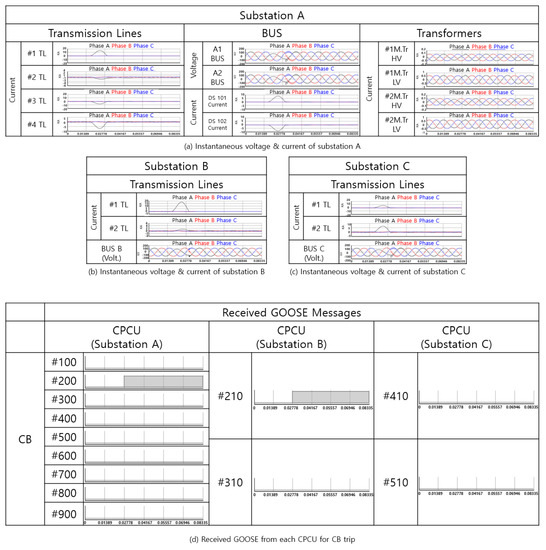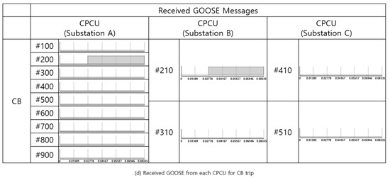 Figure 12 shows the results of the local back-up protection functions. Since the transmission line protection elements of CPCU (Substations A and B) detected that the fault occurred on #1 TL, the GOOSE messages are received to open the #200 and #210 CBs. However, #200 CB was simulated to not open. Thus, the local back-up protection function of CPCU (Substation A) is operated with GOOSE messages of the differential/distance-based directional protection functions and the status of #200 CB to open all the CBs connected to the same busbar as the failed CB. Therefore, from Figure 12, GOOSE messages were received from CPCU (Substation A) to open the #100, #400, and #500 CBs.