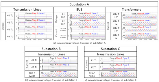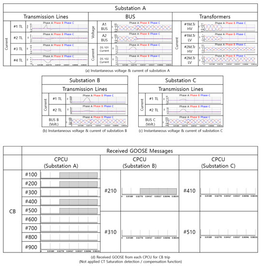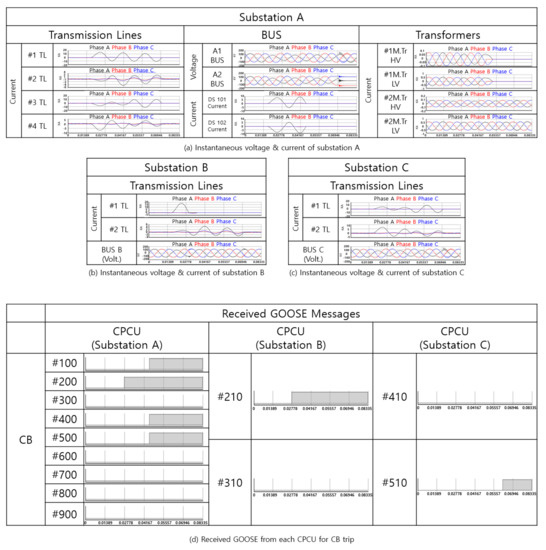 Figure 11 shows the results of the current differential/distance-based directional protection functions. All the graphs of Figure 11a–c presented below are the instantaneous voltage and current of the distributed measuring points of each substation, while the graphs of Figure 11d indicate the received GOOSE messages from each CPCU for trip. Since the fault occurs on #1 TL, #200 and #210 CBs should be opened to isolate the faulty facility. Figure 11 confirms that GOOSE message has been received from CPCU (Substation A) and CPCU (Substation B) to open #200 and #210 CBs, and that the CBs have opened, indicating that the faulted facility is isolated. In RTDS, the CB only opens when the current is zero-crossing, so the timing of the GOOSE message reception and the CB operation may look different.