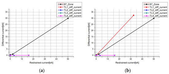 Figure 16 shows the results of the current differential protection element for the conventional scheme and proposed scheme. As shown in the Figure 16a, since the IMU/CT fail is detected, the currents of #1 TL are not input into the protective function. The existing protection method means that, when detecting an IMU/CT fail, even if a differential current is detected, the protection function cannot be performed because the protection function is stopped or the circuit breaker operation element is blocked. However, the proposed scheme properly detected the fault using the current phasor received by the busbar protection element.