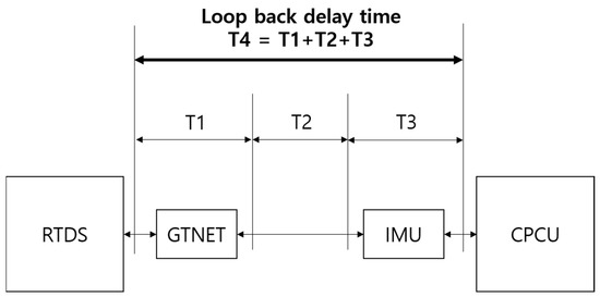 Four transmission lines, two busbars (for double bus), and two power transformers are being protected on the target system with eleven IMUs and three CPCUs. For busbar and power transformer protection, only the IMU data of the local substation are required, but the transmission line protection is carried out through data exchange between CPCUs because protection of the substation requires data from the adjacent substation. Each substation has one CPCU and one grand master clock, and all the devices on the testbed are time synchronized to the grand master clock based on IEEE 1588 PTP. The GOOSE messages from each CPCU are received through GTNET (Network card of RTDS). The voltage and current data of the target system are scaled down, and output via the RTDS front panel. However, to determine the effect of CT saturation, the RTDS is assigned to output the CT secondary side current.