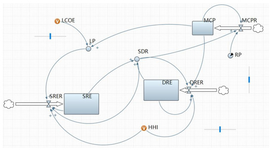 Additionally, the system flow diagrams shown in Figure 2 are built in AnyLogic software. Stocks (SRE, DRE and MCP), flows (SRER, DRER and MCPR), auxiliary variables (LCOE, HHI, LP and SDR) and constant variables (RP) form four causal feedback cycles, which affect one another and are interlinked.