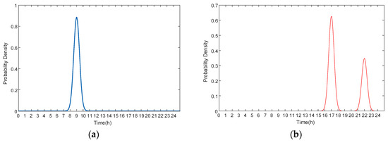 Probability density distribution of (a) arrival and (b) departure times of EVs.