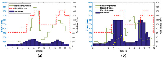 Gas consumption and electricity purchased/sold before and after power consumption optimization are shown in Figure 4, where the electricity price unit is defined as CNY/kWh, which is the same as in other optimization figures. Before optimizing the commercial energy office building, natural gas is generated only by the consumption of heat generated by gas boilers, while the electricity is sourced from the electricity market. From Figure 4a, it can be seen that while local PV is being absorbed, the commercial office building purchases a large amount of electricity during the peak price period, which greatly increases electricity costs and leads to energy inefficiency.