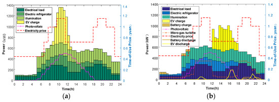 The optimization results before and after energy management in the commercial office building are shown in Figure 5. Before optimization, the commercial building does not participate in the demand response; the CCHP units do not work; and the electricity demand is mainly met by the electricity market, supplemented by PV equipment. When the EV reaches the commercial building, it begins to charge, and commercial users use electricity centrally from 10:00 to 12:00, which remains within peak electricity prices. This not only greatly increases the electricity costs of commercial users, but also causes peak loading of the power grid, which threatens the stability of the power system. After optimization, the charging periods of EVs are obviously shifted to the valley periods (13:00–18:00), and discharges occur during the peak electricity price.