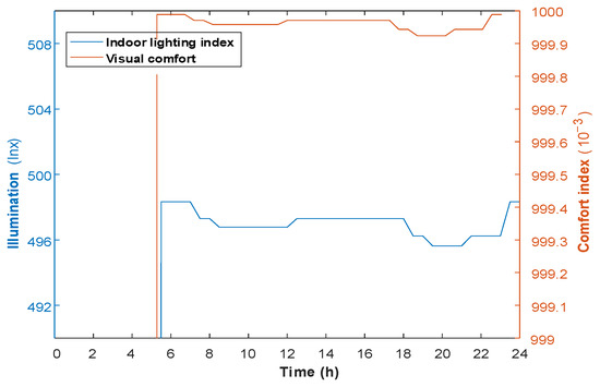 The results of the indoor lighting index and visual comfort for commercial office buildings after power management optimization are shown in Figure 6. Considering that lighting at night is not required by indoor office staff, the indoor lighting index between 00:00 and 6:00 is considered to be 0.
