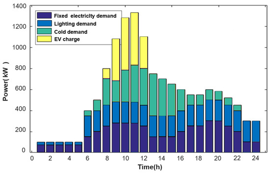 The electricity demand in summer is aimed at cooling, which can be converted directly from electricity or heat. As a special kind of electrical equipment, the charging and discharging behaviors of EVs are random. The lighting demand is evenly distributed during the day, while fixed electricity demand will rise during the peak period of power consumption. The EV starts charging as soon as it reaches the building before optimization. The demand for cooling is highest at noon and in the afternoon. The commercial electricity demand is shown in Figure 7. Among them, the cooling energy generated by electric refrigerators is used for cooling load. In addition, PV generation can supplement electrical energy.