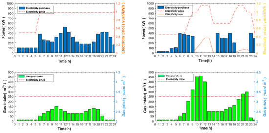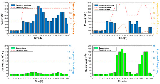 Under the same background, the electricity purchase and natural gas consumption conform to Gaussian distribution and mixed Gaussian distribution. During the day, there is no optimization of power consumption because the electricity price does not fluctuate. In summer, only electricity and lower quantities of gas are used. After interacting with the electricity market, the electricity price in the peak price periods increases, which forces the electricity purchase during peak price periods to decrease. As a result, there is tendency to buy natural gas for electricity generation. Figure 8 shows the comparison between the purchase and sale of natural gas and electricity before and after the commercial office building is associated with the electricity market in summer. The left figures are before optimization, and the right ones are after optimization.