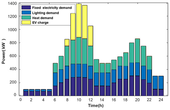 The demand in winter is for electricity and heat, in which heat can be directly produced by natural gas or converted from waste heat of natural gas power generation. Similar to summer, the lighting demand is uniform during the day, and the fixed electricity demand rises during the peak period. Before optimization, EVs will start charging as soon as they arrive at the building. Due to the temperature, the heat demand is strong in the morning and evening. The commercial electricity demand is shown in Figure 9.