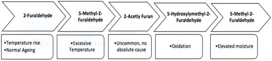 The solid insulation scheme of electrical transformers comprises cellulose paper, and, when susceptible to temperature rises exceeding 100 °C as a result of plentiful operational conditions, it will produce by-products of deterioration, and a few cases are dissolvable in oil [17,18,19]. These by-products are a sequel to the ageing mechanics and become dissolved in the transformer oil; hence, the dielectric oil can be assessed by furan concentration. The latter can be fluently monitored during routine site testing and can be employed as ageing indexes. The high-performance liquid chromatography is generally employed as an oil laboratory for preforming the furan analysis test. Recent investigation formulates a theory that the furan compounds that are produced as a result of electrical discharges have adverse effects on the cellulose paper, although in lower amounts [20,21]. Electrical discharges will generally reduce the degree of polymerization of the cellulose paper, resulting in increased levels of furans being released into the dielectric oil. On account of the thermal stresses, Furanic compounds of large concentrations can be produced, as these cellulosic insulating materials are susceptible to a hotspot temperature exceeding 120 °C [19]. The rate at which these Furanic compounds are produced can be characterized as a function of numerous ageing indexes including oxygen and moisture content. The measurement of Furanic compounds is carried out in micrograms per litre (ug/L). While there are several Furanic compounds, a vast majority of them are not stable over time in the dissolvent. Commonly used Furanic compounds that are employed in the symptomatic assessment of cellulose paper insulation are summarized below: