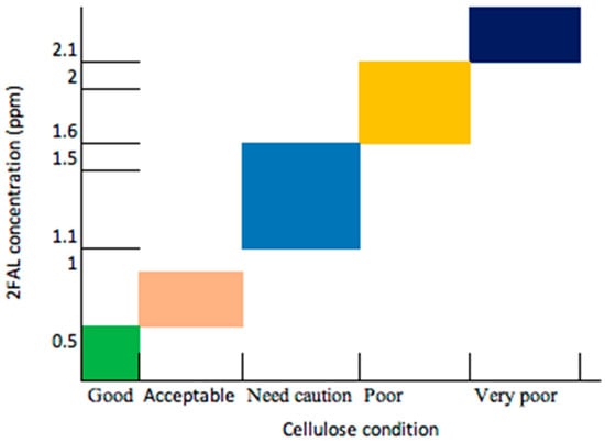 From the observational data presented by various researchers, it has been convincingly observed that 2-furaldehyde (2FAL) is the most stable furan compound in assessing the condition of cellulose paper. As a result, it has been adopted by the transformer manufacturing industry as an index that can conclusively predict the DP in cellulose paper. The condition of the transformer cellulose paper based on 2FAL has been demonstrated in Figure 2 using the inhouse empirical data of mineral-based transformers ranging between 1500 kVA and 40 MVA. These units are based on the south African power utility specification.
