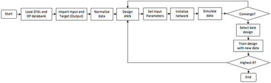 The proposed model will produce the network output target of a new dataset based on the input (2FAL) and the targeted DP output fed to the ANN network. Figure 5 illustrates a comprehensive flowchart employed in developing the proposed ANN model. By and large, the methodology for formulating an ANN model is segmented into the training and testing stage.