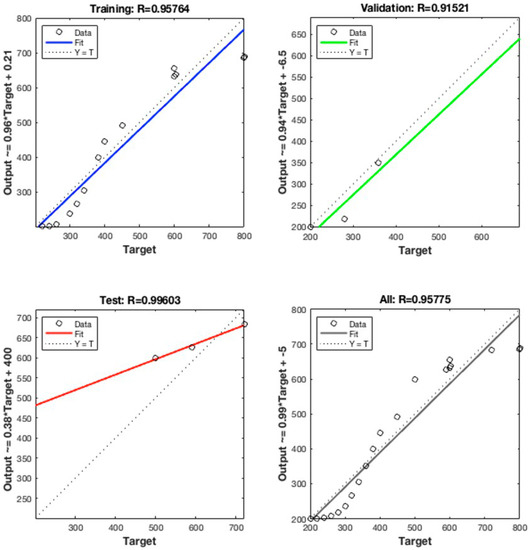 During the ANN testing, an unfamiliar dataset is introduced to the network to appraise the performance of the trained network. At this stage, the ANN network is assessed by employing linear regression modelling. The correlation coefficient (R) is calculated to examine the correlation between the ANN network outputs and the targeted output. Ideally, a good network will yield an R close to 1, demonstrating a significant correlation between the ANN network output and the targeted output. The overall performance of the ANN network is based upon the value of R that is ascertained. The most suitable ANN network is selected based on the nearest correlation value to 1.