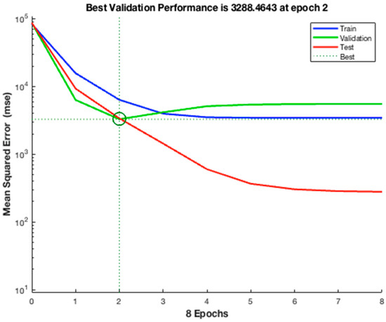 It can be observed that, initially, the network yields a significant MSE, but there is a gradual decrease as the training progresses to eight epochs. The best MSE was ascertained at Epoch 2, as indicated above.