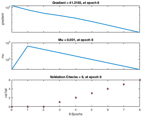 The gradient, which is the square of the error function, can be observed to be 41.32 at Epoch 8. Additionally, the network control parameter denoted as “mu” is observed to be 0.0001 at Epoch 8. This is a good indication that the network has holistically converged. Further, it can be observed that there are six “val fail” validation checks at Epoch 8. This prevents the network from performing poorly while learning.