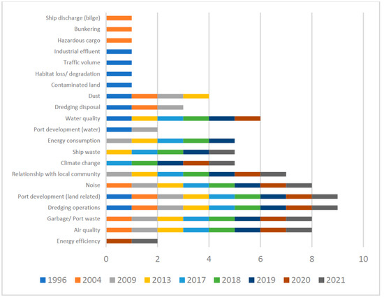 Environmental priorities monitored by seaports in the period form 1996–2021 Source: own elaboration on the base of: [22,23,24,25,26,27,28,29,30,31,32,33,34,35,36,37,38,39].