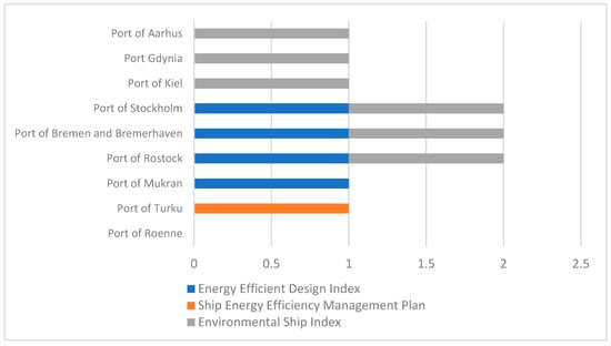 The conducted research reveals that ports in Northern Europe consider the introduction of various indicators into the monitoring system regarding port waste and energy efficiency. However, the Port of Roenne applies neither EEDI, nor SEEMP and ESI yet, the Port of Turku fails to apply EEDI and ESI yet, while the survey results on the Port of Kiel indicate that the port applies none of the above-mentioned indicators (Figure 3).