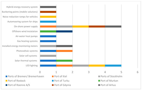 Pro-ecological solutions applied in the surveyed seaports in Northern Europe. Source: own elaboration on the base of: [23,24,25,26,27,29,30,31,32,33,34,35,36,37,38,39,45].