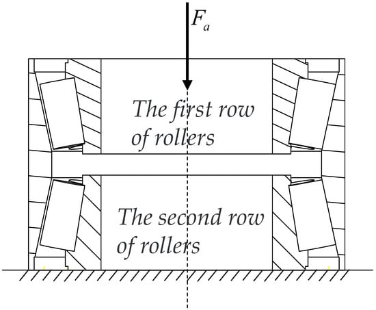 According to the working conditions of the test bearing, we established the calculation model of roller contact load distribution under axial load only. Compared with the contact load between the roller and the inner and outer rings, there is little normal force between the roller and the cage pocket. We can ignore the tangential friction between the roller and the cage pocket in the calculation. The test bearing is shown in Figure 1 and is the axial load.
