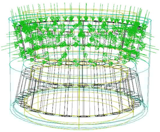 The heat generated at every roller and raceway contact area is evenly distributed along the surface of the rollers and ferrule. The heat generated at every roller and retaining edge contact area is evenly distributed along the surface of the rollers and retaining edge. The viscous friction loss of grease is evenly distributed along the surface of the rollers, and the heat flow load is carried out on the model, as shown in Figure 6.
