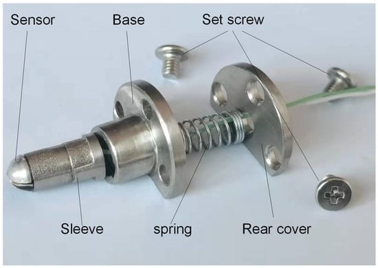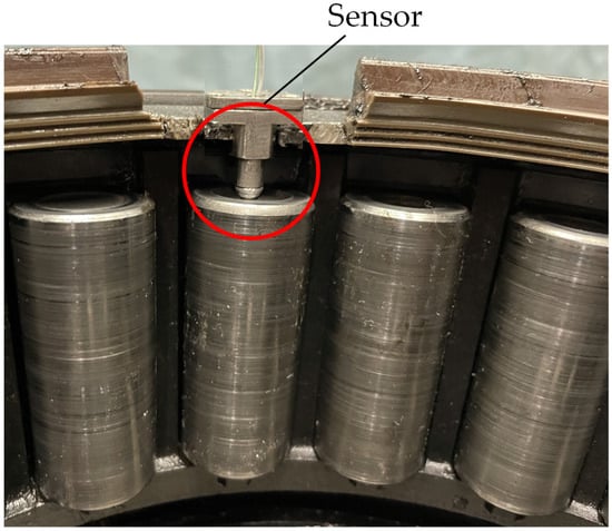 In this paper, the sensor is the self-developed adaptive thin-film thermocouple temperature sensor [26], as shown in Figure 7. When the train running speed is 360 km/h, the corresponding wheel speed is about 2220 r/min. After calculation, the time for the large end face of a single roller to pass through a fixed point is 1.6ms, and the dynamic response time of the sensor is 1.42 μs. It meets the requirements of roller temperature measurement. The set screw fixed the sensor on the sealing cover. The temperature measuring end of the sensor is a hemispherical body with a diameter of 5 mm, which is in contact with the large end face of the roller during temperature measurement. We set the sensor mounting position as shown in Figure 8.