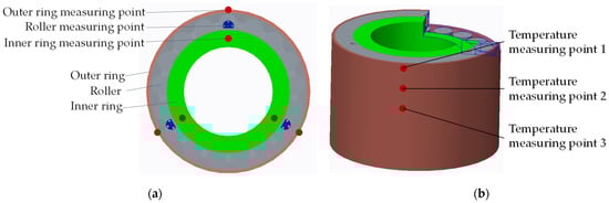 Location of temperature measuring point of railway bearing: (a) circumferential temperature measuring point; (b) axial temperature measuring point of outer ring.