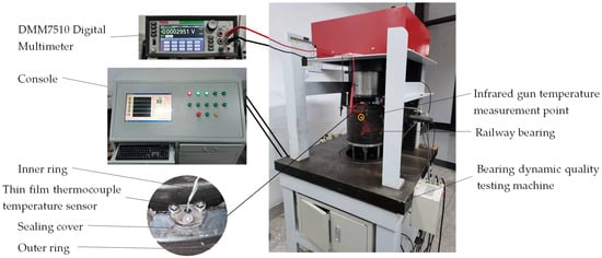 The railway bearing thermal analysis test-bed is shown in Figure 10, which mainly includes the bearing dynamic quality detection test machine [28], mechanical system control box, digital multimeter, and adaptive thin-film thermocouple temperature sensor.