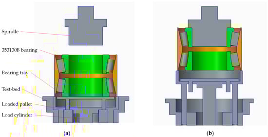 The specific workflow includes the following steps: start the measurement program, and the loading cylinder will push the loading disc upward. When the loading disc contacts the end face of the bearing outer ring, the bearing outer ring begins to move upward. Under the action of gravity, the second row of bearing (inner ring, rolling element, and retainer) and the intermediate spacer will sag freely and separate from the outer ring. The loading disc continues to push the bearing upward until the mandrel is fully matched with the inner ring of the first row of the bearing, as shown in Figure 11. Set the spindle speed and continue the program. The motor drives the spindle to rotate. After one measurement, the loading cylinder drops, returns the bearing to its original position, manually turns over the tested bearing, repeats the above process, and measures the bearing on the other side.
