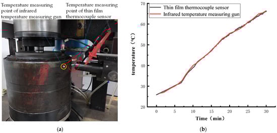 To improve the accuracy of the measurement results, before the temperature measurement test of the bearing, the temperature measurement comparison test is carried out between the infrared temperature gun and the thin-film thermocouple sensor. We closed and fixed the measuring end of the thin-film sensor on the outer surface of the bearing outer ring, and fixed the infrared temperature measuring gun so that its temperature measuring point was located on the same contour line as that of the thin-film temperature sensor, as shown in Figure 12a. We set the spindle speed to 1000 rpm for the temperature measurement comparison test.