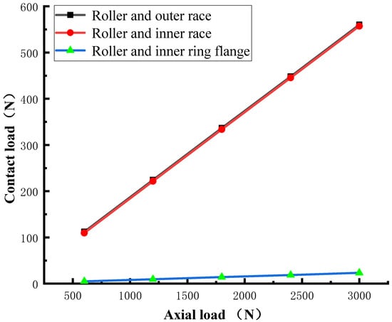 The spindle speed is 800 rpm, and the axial load is 600 N, 1200 N, 1800 N, 2400 N, and 3000 N, respectively. We calculated the change in contact load inside the bearing, as shown in Figure 13. The results show that the contact load inside the bearing increases linearly with the increase in axial load, which is mainly reflected in the rise in contact load between the inner and outer race raceways and rollers.