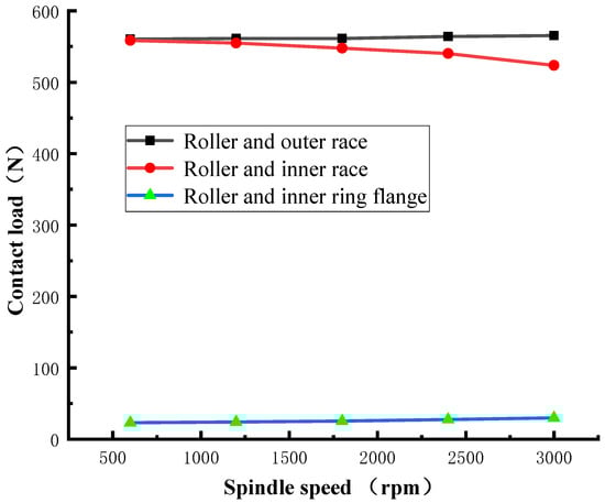 The axial load is 3000 N, and the spindle speed is 600 rpm, 1200 rpm, 1800 rpm, 2400 rpm, and 3000 rpm, respectively. We calculated the change in contact load inside the bearing, as shown in Figure 14. The results show that with the increase in spindle speed, the contact load between the outer ring and the roller and the contact load between the large flange of the inner ring and the roller gradually increases. In contrast, the contact load between the inner ring and the roller decreases gradually because the centrifugal force of the roller increases gradually with the increase in rotating speed, to reduce the pressure of the roller on the inner ring.
