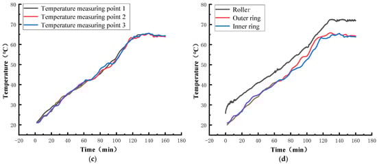 As shown in Figure 16, the circumferential temperature distribution of railway bearing is uniform. The temperature rise characteristics of the axial temperature measuring point of the outer ring are slightly different, and the temperature of temperature measuring point 3 is low because the temperature measuring point 3 is far away from the bearing heat source and has good heat dissipation. Figure 16d shows that the inner ring, roller, and outer ring have different temperature rise characteristics during operation. After the temperature is stable, the roller temperature is higher than that of the inner and outer rings. The stable temperature of the roller is 72.02 °C, the stable temperature of the inner ring is 65.55 °C, and the stable temperature of the outer ring is 64.67 °C. It is caused by heat loss in the process of heat conduction.