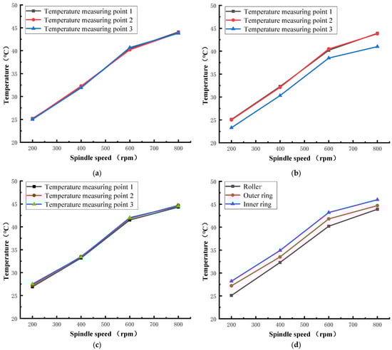 Figure 17 shows the temperature rise of the bearing inner ring, roller, and outer ring at different speeds. With the increase in rotating speed, the temperature of the inner ring, roller, and outer ring also increases rapidly. The average temperature of the roller is higher than that of the inner ring. The average temperature of the inner ring is higher than that of the outer ring (see Figure 17d). The rotating speed increases from 200 rpm to 800 rpm. The temperature of the roller increases from 28.2 °C to 46 °C. The temperature of the outer ring increases from 25.1 °C to 43.9 °C. The temperature of the inner ring increases from 27.2 °C to 44.7 °C. Therefore, the temperature rise of the outer ring changes the most (18.8 °C), followed by the roller (17.8 °C), and the temperature rise of the inner ring changes the least (17.5 °C). As shown in Figure 17d, the temperature rise rate decreases when the speed is higher than 600 rpm. Because with the increase in temperature, the viscosity of grease becomes lower, the lubrication performance is improved and the viscous friction loss and the heat production are reduced.