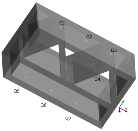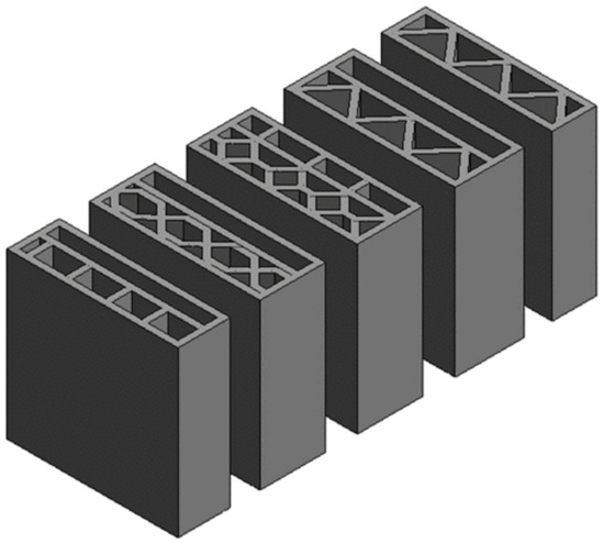 For numerical study, several structures were selected that differed from each other in the internal structure of the cavities but were similar in form factor. These designs are the most typical for practical applications. Except for the structures’ depths, the tested samples’ linear dimensions remained the same for all samples (Figure 1).