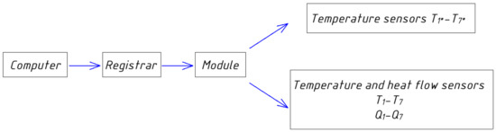 The device consists of a registrar, a module, temperature and heat flow sensors, and connecting cables. Schematically, the principle of operation is shown in Figure 2.