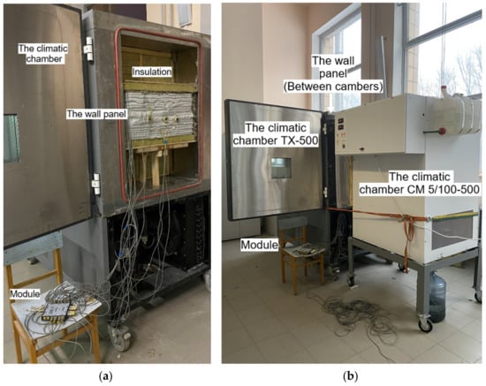 Stand with the additive wall panel. (a) The sample is placed in a climate chamber No. 1.; (b) The sample is placed between two climatic chambers, the start of testing.