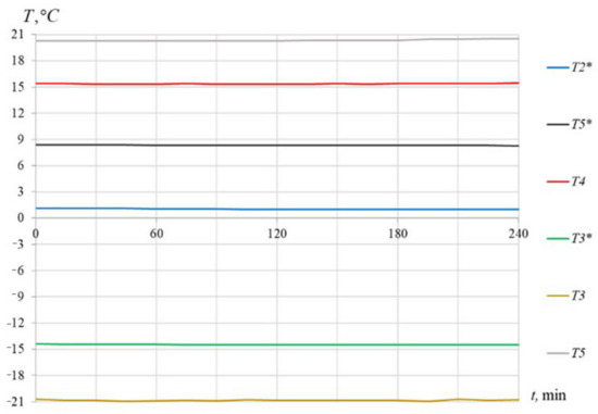 The time of temperature drop in the experimental sample of 3D-printed enclosing structure (Section 1.1) was evaluated: temperature sensors were located on each surface of the sample (Figure 3), which made it possible to evaluate the temperature profile.