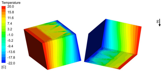 Convection effects are most noticeable on the construction’s side (Figure 10). The temperature isoline becomes more curved while moving the construction’s center from either the hot or cold side. The temperature difference between the lower and the upper sides in the center of the object’s side face is about 5 °C.