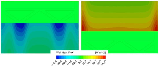 - The heat flux through the solid parts of 3D-printed enclosing structures is severely higher (up to 2×) than the heat flux through the air parts of the structures. The convection also influences heat flux distribution on surfaces. If the temperature gradients change because of convection, the heat flux changes (from 100 to 70 W/m2) along the vertical coordinate.