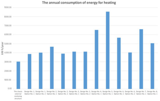 Design No. 5 (Option No. 1) is the leader according to the annual energy consumption for heating the building. From the point of view of thermal engineering, this construction is the weakest. In the future, more heat will leave the room through it.