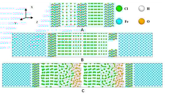 Figure 1 shows the schematic of the corrosion model established in this work. Model A contains only chlorine, hydrogen chloride, and iron oxide to verify the corrosion resistance of Fe2O3 to such gases (Figure 1A). Model B is pure iron covered with a Fe2O3 film, wherein the right film has holes (Figure 1B), to simulate the corrosion of the metal wall’s surface by chlorine and hydrogen chloride during biomass combustion. Model C is used to simulate the corrosion of the Fe2O3/Fe system by aqueous mixed gas (Figure 1C). A total of 756 iron atoms are present on both sides of models B and C. The number of Fe2O3 on the right side of model B is 24, and that of Fe2O3 films is 40. See Table 1 for additional details.