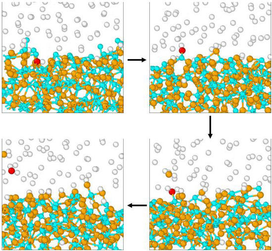 Figure 2 shows the structure of model A (0.5 ns) at the end of the simulation. The results show that chlorine hardly reacts with iron oxide, but some oxygen atoms in the iron oxide on the hydrogen chloride side begin to detach. The removal process of oxygen in iron oxide by hydrogen chloride is shown in Figure 3. The hydrogen dissociated from hydrogen chloride is combined with the oxygen on the surface of the iron oxide; the protonated oxygen continues to move outward, with an increased probability of collision with hydrogen, and the protonated oxygen escapes from the surface of the iron oxide surface after combining with another hydrogen ion to form a water molecule.
