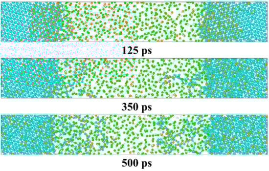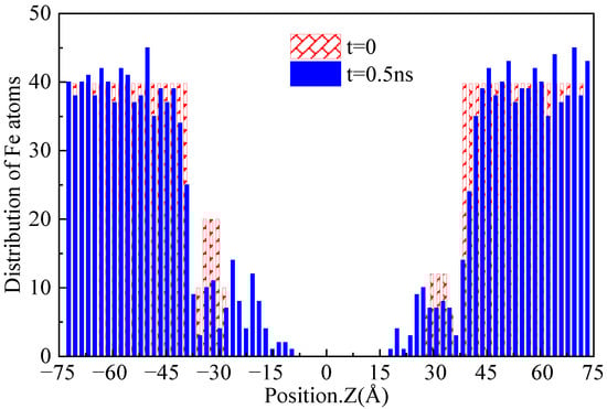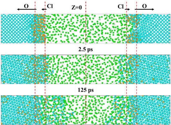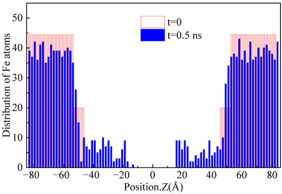 Figure 5 shows the distribution of iron atom numbers at the beginning and end (t = 0.5 ns) of the simulation of model B. At the beginning of the simulation, the Fe2O3 layer on the right side of model B has a gap defect, so the number of iron atoms is slightly less than that on the left side. After the simulation, the numbers of corroded iron atoms on both sides are 97 (left) and 71 (right). Among them, the numbers of iron atoms moved by the Fe2O3 layers on both sides are 80 (left) and 48 (right). Therefore, only 17 (left) and 23 (right) iron atoms come from the iron’s atom layer; that is, 2.25% and 3.04% of the iron atoms on both sides, respectively, were corroded (calculated from 756 iron atoms on each side, as shown in Table 1). For such simulation results, we believe that due to the gap defect on the right side, chlorine and hydrogen chloride can directly react with iron atoms through the gap of the Fe2O3 layer, so the side with the gap has a higher probability of iron corrosion. In addition, further analysis of the oxygen and chlorine diffusion behavior is required.