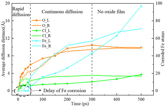 In this work, the corrosion degree is described by the number of corroded iron atoms and contains two parts: from the Fe and Fe2O3 layers. The corrosion degree starts to develop in the rapid diffusion stage of the element. However, a certain delay relative to the diffusion of oxygen and chlorine (Figure 6, approximately 20–40 ps, 40–80% of the rapid diffusion stage) can be observed because oxygen diffusion is required to reach a certain amount for the reaction between chlorine and FexOy. On the right side, the oxidation time is incomplete, and the corrosion start time is early; that is, the delay time is relatively short. The number of corroded iron atoms on the left side is nearly linear, while the growth rate on the right side gradually decreases. At 300 ps, Fe_L and Fe_R are 43 and 57, and the numbers of molecules on both sides of the Fe2O3 film are 40 and 24 (Table 1). The left oxide film is nearly obscured (completely changed into FexOy mixture), and the right one is completely corroded. When the simulation entered the late stage (>300 ps), the oxide film on the left side was gradually corroded; therefore, the protective effect on the iron atomic layer was greatly reduced. Since the oxide film on the right side has a gap defect and the delay time is lower than that on the left side, the destruction of the complete oxide film on the left side has a greater impact on the number of corroded iron atoms in the late stage. In addition, the number of iron atoms on the left and right sides is different. This is the reason why the increasing trend of the number of corroded iron atoms on the left side is more severe than that on the right side in the late stage. It can also be explained well from the simulation results in Figure 4.