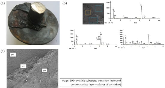 Chlorine corrosion experimental study by Król et al. [24]. (a) A layer of porous corrosion products; (b) the numbers 1–3 as marked points represent the chemical composition of the surface of the St41K boiler steel in the planes pt1, pt2, and pt3 on the microscopic photo; (c) microscopic photo (SEM) of the surface of the St41K boiler steel.